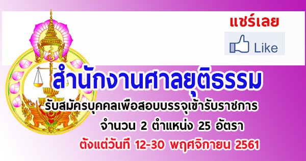 สํานักงานศาลยุติธรรม รับสมัครบุคคลเพื่อสอบบรรจุเข้ารับราชการจำนวน 2 ตำแหน่ง 25 อัตรา สมัครออนไลน์ ตั้งแต่วันที่ 12-30 พฤศจิกายน 2561รายละเอียดเพิ่มเติมคลิกที่นี่ สมัครออนไนล์คลิกที่นี่