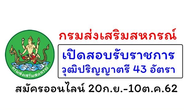 กรมส่งเสริมสหกรณ์ เปิดรับสมัครสอบเพื่อบรรจุบุคคลเข้ารับราชการ จำนวน 43 อัตรา รับสมัครทางอินเทอร์เน็ต ตั้งแต่วันที่ 20 กันยายน - 10 ตุลาคม 2562