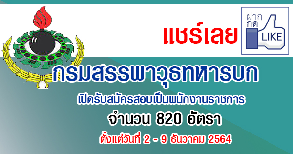 กรมสรรพาวุธทหารบก เปิดรับสมัครสอบเป็นพนักงานราชการ 820 อัตรา รับสมัครทางอินเตอร์เน็ต ตั้งแต่วันที่ 2 - 9 ธันวาคม 2564