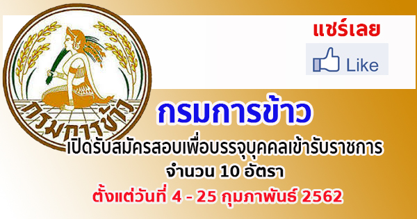 กรมการข้าว เปิดรับสมัครสอบเพื่อบรรจุบุคคลเข้ารับราชการ จำนวน 10 อัตรา รับสมัครทางอินเทอร์เน็ต ตั้งแต่วันที่ 4 - 25 กุมภาพันธ์ 2562