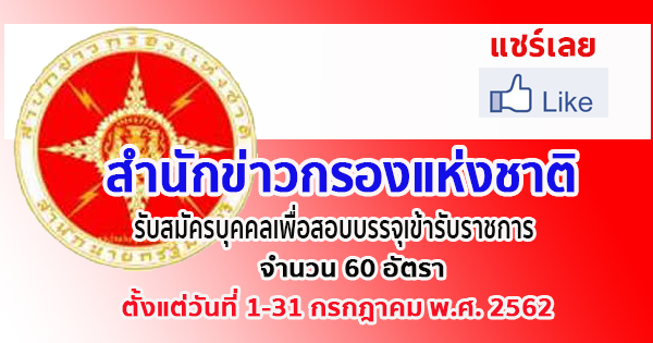 สำนักข่าวกรองแห่งชาติ เปิดรับสมัครสอบเพื่อบรรจุบุคคลเข้ารับราชการ จำนวน 60 อัตรา รับสมัครทางอินเทอร์เน็ต ตั้งแต่วันที่ 1 - 31 กรกฎาคม 2562