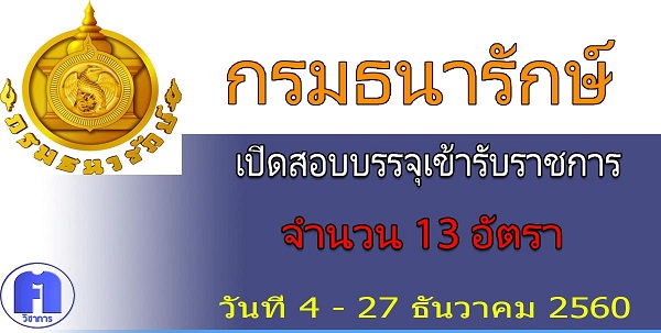 กรมธนารักษ์ เปิดรับสมัครสอบเพื่อบรรจุบุคคลเข้ารับราชการ จำนวน 13 อัตรา รับสมัครทางอินเทอร์เน็ต ตั้งแต่วันที่ 4 - 27 ธันวาคม 2560